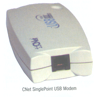 2.3.5 CNet SinglePoint 56K USB Modem. Модем 56К USB из линейки коммуникационных устройств CNet SinglePoint имеет только два разъема – USB и телефонный RJ-11. Питание осуществляется по шине USB. Модем совершенно универсален – его удобно использовать как с ноутбуком ( он на чуть не тяжелее модема формата PC Card), так и настольным компьютером, оборудованным USB-концентратором. Единственный двухцветный световой индикатор отражает состояние модема – от инициализации до отправки/приема сообщений. Установка драйвера происходит без проблем. Плюс на прилагаемом CD-ROM поставляется PDF-руководство и внушительный набор программного обеспечения, включая программы Internet Explorer 5.0, Netscape Communicator 4.6, Eudora Light, Net2Phone,MediaRing Talk 99, Real Player G2 и многие другие. Опыт работы с модемом показал, что даже на плохой линии он устанавливает достаточно скоростное (21,6 кбит/с) и устойчивое соединение. Производительность и устойчивость модема к помехам сопоставима с соответствующими характеристиками модемов USR Courier, снабженных русской «прошивкой». В модеме реализован стандарт V.90, возможна модернизация прошивки во флэш-ПЗУ. Модем поддерживает режим пониженного энергопотребления.(3)