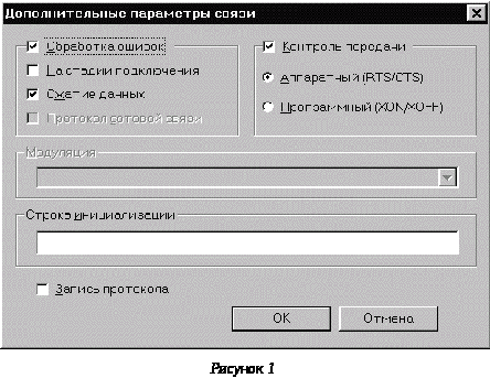 После физического подключения модема, необходимо произвести инсталляцию программного обеспечения. Рассмотрим пример инсталляции при работе с операционной системой Windows 95. При включении компьютера после загрузки, Windows определяет наличие нового устройства и запрашивает необходимость подключения драйверов нового устройство. Существует две возможности либо установить драйвер с дискеты, идущей в комплекте с модемом (наилучший вариант), либо использовать встроенные драйверы Windows 95. Далее можно установить коммуникационную программу QuickLink Message Center поставляемую вместе с модемом и позволяющую наиболее полно реализовать возможности данного модема. Но установка данной коммуникационной программы не обязательна, т. к. можно использовать и другие программы. Например Telemax, Term95, поставляемые в комплекте Norton Commander 5.0, HyperTerminal (Windows 95) и др. Настройка параметров модема в Windows 95: Пуск Настройка Панель управления Модемы: Вкладке «Общие»: Свойства: Вкладка «Общие»: позволяет установить COM- порт, , громкость динамика, максимальную скорость Вкладка «Установка связи» позволяет установить параметры связи (количество бит данных, четность, стоповые биты), параметры вызова, а также дополнительные параметры связи (см. рис. 1).