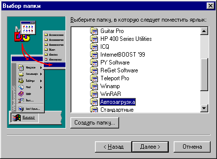 7.В списке папок выберите пункт Автозагрузка и нажмите кнопку Далее.