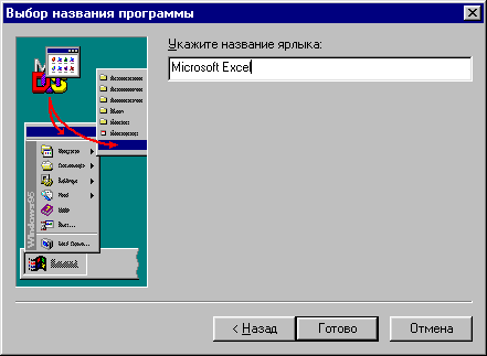 8.В поле имени ярлыка введите соответствующее имя, например, Microsoft Excel, и нажмите кнопку Готово.