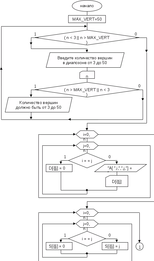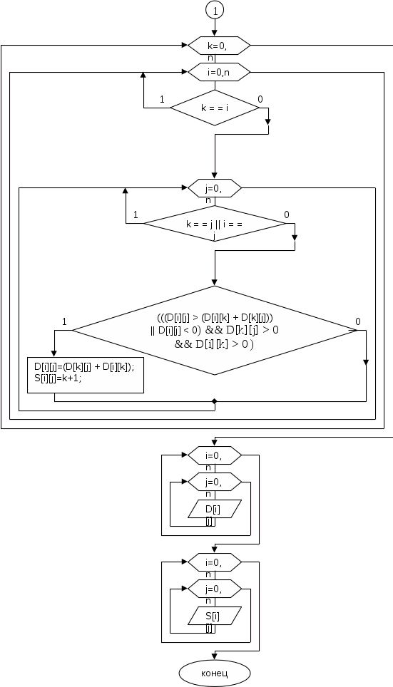 Алгоритм Флойда находит кратчайший путь между любыми двумя узлами сети. В этом алгоритме сеть представлена в виде квадратной матрицы с n строками и n столбцами. Элемент (i ,j) равен расстоянию d>ij> от узла i к узлу j, которое имеет конечное значение, если существует дуга (i ,j), и равен бесконечности в противном случае.
