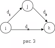 Покажем сначала основную идею метода Флойда. Пусть есть три узла i, j и k и заданы расстояния между ними (рис. 3). Если выполняется неравенство d>ij>> >+ d>jk> < d>ik>, то целесообразно заменить путь i → k путем i → j → k. Такая замена (далее ее будем условно называть треугольным оператором) выполняется систематически в процессе выполнения алгоритма Флойда.