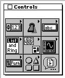 Передняя панель VI - прежде всего комбинация средств управления и индикаторов. Средства управления моделируют реальные устройства ввода данных и обеспечивают их поступление в блок-схему VI. Индикаторы, моделируют реальные устройства вывода, которые отображают данные, полученные на выходе блок-схемы VI.Вы добавляете средства управления и индикаторы на переднюю панель, выбирая их из т.н. “всплывающей палитры средств управления”(из списка имеющихся в наличии компонент), показанной на рис.2: