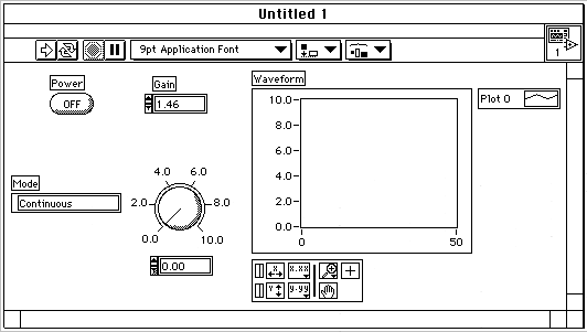 Интерактивный интерфейс пользователя VI назван Передней Панелью, потому что он моделирует панель реального прибора. Передняя панель может содержать кнопки, переключатели, индикаторы, диаграммы, графики, и другие средства отображения и управления. Вы вводите данные, используя мышь и клавиатуру (имитируя действия с реальной передней панелью ) , и затем просматриваете результаты на экране компьютера.