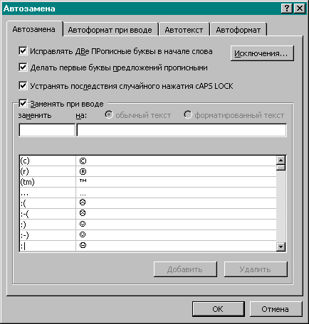 У автозамены есть несколько режимов, которые можно оставить или отключить, например, можно задать исправление двух прописных букв в начале слова. Выбрать команду Сервис, Автозамена – откроется диалоговое окно Автозамена. Если нужно отключить этот режим, сбросить флажок Заменять при вводе. Кнопка Исключения предлагает добавить те сокращения, которыми приходится пользоваться постоянно, чтобы в режиме автозамены следующее после них слово не начиналось автоматически с заглавной буквы. Можно также указать слова, которые требуют наличия двух заглавных букв в начале, чтобы и они не исправлялись автоматически.