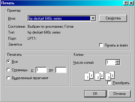 Указание диапазона страниц, посылаемых на печать. Вы можете выбрать, будет распечатан весь документ, или только указанные страницы, или же только выделенный фрагмент текста.