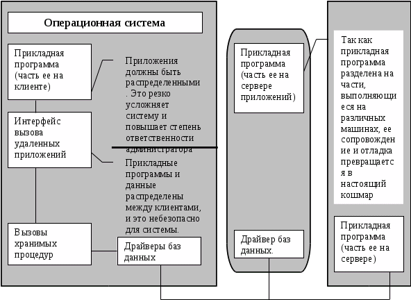 В современном мире чаще всего применяется сервер приложений для реализации ядра информационной системы. В распределенной вычислительной системе сервер приложений берет на себя функцию распределения нагрузки между серверами, которые в общем случае могут работать под разными операционными системами, или находится в разных географически местах. Сервер приложений – это мостик между программами-клиентами и одним или несколькими серверами базы данных. За счет сервера приложений можно снизить нагрузку на приложения пользователя и реализовать сложные правила объектной модели базы данных, которые трудно или нерационально реализовывать на стороне сервера базы данных. В результате, сервер приложений снижает трафик между сервером базы данных и компьютером клиента, повышая общую производительность информационной системы. Исходя из сказанного ранее, на приложение пользователя остается только реализация интерфейса. Такая структура информационной системы называется многозвенной, а приложение пользователя – тонким клиентом. Надо отметить, что в общем случае серверы приложений могут посылать команды друг другу, и взаимодействовать, таким образом, самым рациональным способом с географически удаленными серверами баз данных. Например, для получения отчета с большим количеством вычисляемых полей, нет необходимости делать несколько запросов к удаленной базе данных через Internet, если это может сделать сервер приложений, находящийся в непосредственной близости от сервера базы данных. Он и пошлет в ответ готовый отчет.