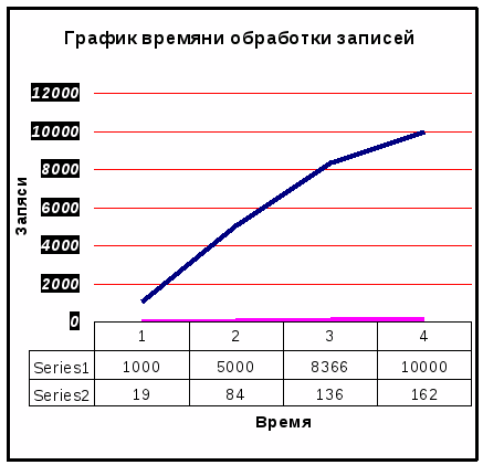 Тестирование программы проводилось на 4 массивах данных размером 1000, 5000, 8366, 10000 записей. Метод тестирования заключался в поиске последней записи массива по уникальному названию, чтобы определить время поиска по всему массиву. Полученные данные приведены в таблице и на основе данных построен график (см. график).