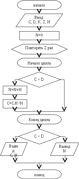 Исходными данными будут начальная концентрация С вредных веществ в реке, предельно допустимая концентрация D и коэффициент К. Результат – последовательностью значений концентрации вредных веществ через сутки, двое суток и т. д. Связь между исходными данными и результатом дается следующими соотношениями: