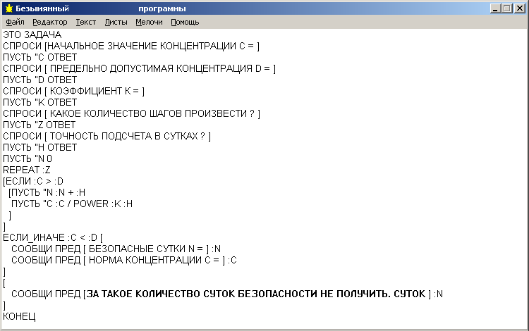 D – предельно допустимая концентрация, K – коэффициент, Z – ограничения количества шагов для расчета, H – точность подсчета в сутках, N - количество суток.