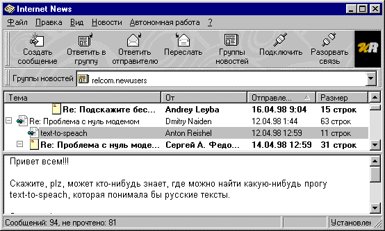 При этом появится окно редактирования сообщения (Рис. 8). Имя конференции автоматически подставляется в поле "Группа новостей".
