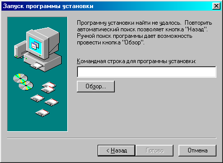 Рис. 2. Данное окно означает, что Windows 98 не смогла найти инсталляционную программу для установки вашего приложения, и вам придется выполнить процесс установки самостоятельно