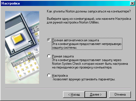 4. Окно Настройки позволяет выбрать предложенные конфигурации: Полная автоматическая защита (непрерывная защита системы); Ручная (защита через Norton System Check, которая может быть настроена на периодическую проверку компьютера); Настройка (позволит вручную установить параметры). В нашем случае мы выбираем Полную автоматическую защиту и нажимаем Далее.
