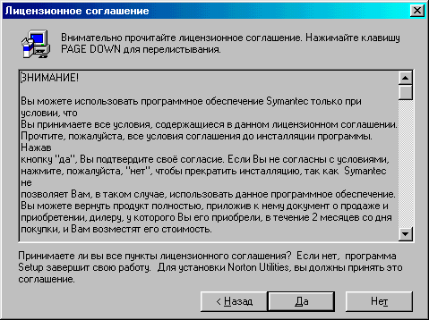 1. Запускаем программу установки (заходим на \\Server\Distr\Norton Utilites 2000 и запускаем программу установки setup.exe. Перед нами появляется окно с текстом лицензионного соглашения. Для перелистывания используйте клавишу Page Down. Если после прочтения вы нажмете клавишу НЕТ, то Setup завершит свою работу. Для продолжения установки нажмите клавишу ДА.