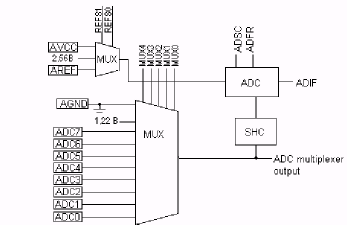 Аналого-цифровой преобразователь имеет свое собственное прерывание ADC (вектор $1С), которое может быть активизировано по завершению преобразования. Когда обращение к регистрам запрещено, в процессе считывания регистров ADCL и ADCH, прерывание будет активизироваться, даже при потере результата.