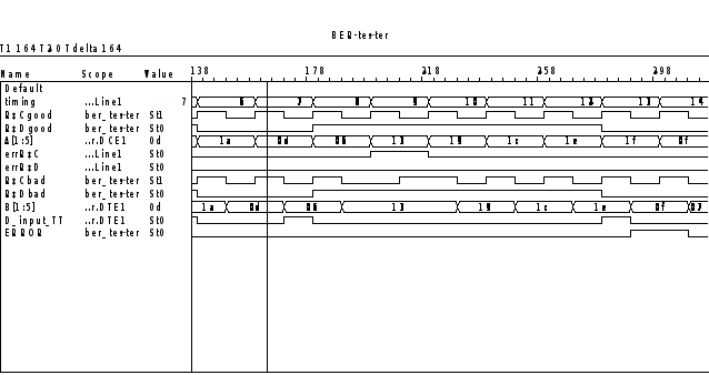 Рис. 4.2. Пример временных диаграмм сигналов BER-тестера, полученных в результате моделирования. Из них следует, что ошибка при передаче синхросигнала по линии обнаруживается
