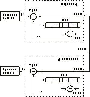 Рассмотренная система передачи данных не требует применения какой-либо специальной процедуры начальной синхронизации. После заполнения сдвигового регистра RG2, как было показано, генераторы псевдослучайных битовых последовательностей работают синхронно (их состояния всегда одинаковы). При появлении одиночной ошибки в линии синхронизация временно нарушается, но затем автоматически восстанавливается, как только правильные данные вновь заполнят регистр RG2. Однако в процессе продвижения ошибочного бита по сдвиговому регистру RG2, а именно, в периоды его попадания сначала на первый, а затем на второй вход элемента XOR3 сигнал Y2 дважды принимает неправильное значение. Это приводит к размножению одиночной ошибки – она впервые появляется в сигнале RD в момент поступления из линии и затем возникает еще два раза при последующем двукратном искажении сигнала Y.