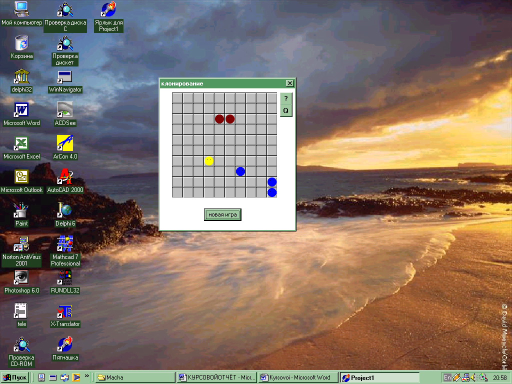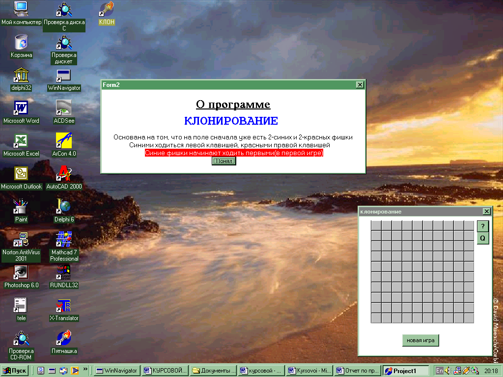 Смысл этого курсового проекта состоит в том, чтобы создать программу игрового типа “Клон”. При запуске файла игры появляется окно на котором расположено игровое поле представляет собой клеточное поле (сетку) десять на десять, в котором при нажатии на кнопку “Новая игра” в четырех углах появляются фишки в виде “мордашек”, две синих и две красных, которые располагаются крест на крест. В игре участвуют два игрока, каждый игрок должен делать по одному ходу. Суть игры состоит в том, чтобы один из игроков смог перекрасить как можно больше чужих фишек, либо в середине игры, либо по окончанию игры. Игра заканчивается после того, как на игровом поле не останется фишек одного цвета, либо все поле будет заполнено, тогда появляется окно со счетом красных и синих фишек. Также целью игрока является просчитование каждого хода для того, чтобы не дать возможность противнику перекрасить свои фишки, и тем самым победить в этой игре и набрать большее количество очков, чем его противник, если поле уже заполнено. Эта игра позволяет пользователю улучшить свои умственные способности, развить логическое мышление. Играя в эту игру он может показать свое превосходство над противником, тем самым доказать свою целеустремленность. Учит его быстрой реакции на изменяющиеся условия игры. Игра была полностью написана на языке Delphi 6. Delphi-это среда разработки программ, ориентированных на работу в Windows. В основе идеологии Delphi лежат технология визуального проектирования и методология объектно-ориентированного программирования. Для представления программы Delphi используется язык Object Pascal. Среда Delphi - это сложный механизм, обеспечивающий высокоэффективную работу программиста. Delphi - превосходный инструмент, с помощью которого программист может создать прекрасный интерфейс пользователя к прикладным программам самых различных классов. Кроме того, Delphi позволяет работать с любыми базами данных, создавать прикладные программы для работы с Интернет и многое другое. Delphi - постоянно развивающаяся система. Она дает пользователю большой спектр возможностей. Воспользовавшись ими, программист может создавать различного рода программы. Даже такие как игры.