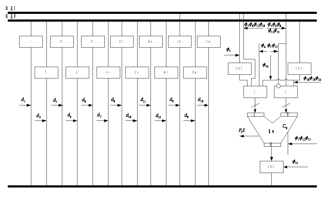 В структуре М-автомата использованы две шины данных ШД1 и ШД2. Они соединены с входами АЛУ А1 и А2 соответственно. Разделим множество операндов АЛУ на два подмножества исходя из условий.