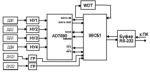AD7890 (далее АЦП) служит для того чтобы, переключать требуемый канал коммутатора, преобразовать аналоговую величину напряжения в соответствующий ей двоичный цифровой код.