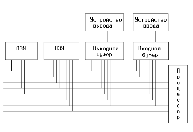Шинная организация получила широкое распространение, поскольку в этом случае все устройства используют единый протокол сопряжения модулей центральных процессоров и устройств ввода/вывода с помощью трех шин.
