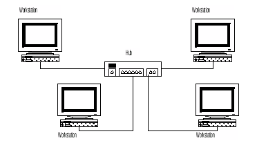 широковещательную звездообразная сеть, предусматривающую использование центрального узла как безбуферного повторителя, который направляет все приходящие сигналы во все исходящие из него линии.