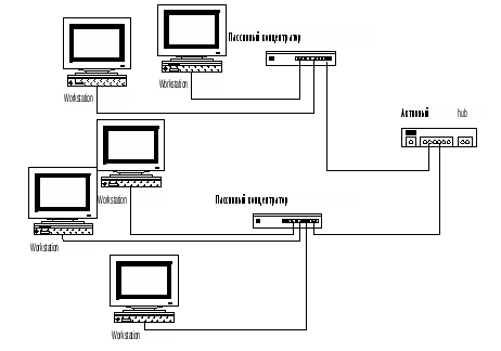 Гибридные концентраторы.Гибридными (hybrid) называются концентраторы, к которым можно подключать кабели различных типов. Сети, построенные на концентраторах, легко расширить, если подключить дополнительные концентраторы.