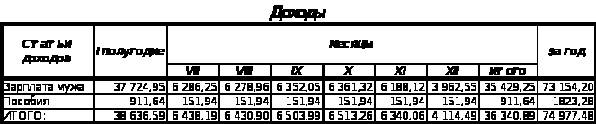 | Зарплата мужа | 37 724,95 | 6 286,25 | 6 278,96 | 6 352,05 | 6 361,32 | 6 188,12 | 3 962,55 | 35 429,25 | 73 154,20 |