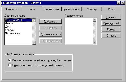 В меню Поле: представлены все поля, которые есть в базе. В меню Поля отчета: нужно добавить те поля из базы, которые надо включить в отчет. Если в отчете должны быть все поля, то надо нажать кнопку Добавить пес», и меню появятся все поля. Если в отчет надо включить только часть полей базы, то надо выделить нужное поле в меню Поле:, щелкнув по названию поля мышкой, затем нажать на кнопку Добавить », при это нужное поле будет вставлено в отчет.