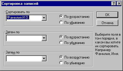 Чтобы осуществить сортировку, надо в меню Вид выбрать строку Сортировка записей..., появится диалоговое окно: