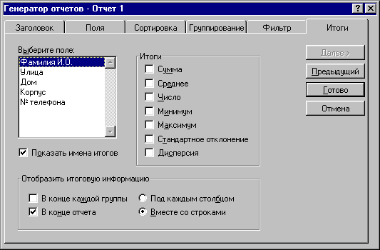 Дальше идут Сортировка, Группирование, Фильтр. Когда поля отчета готовы, в закладке Итоги появится диалоговое окно статистических функций отчета: