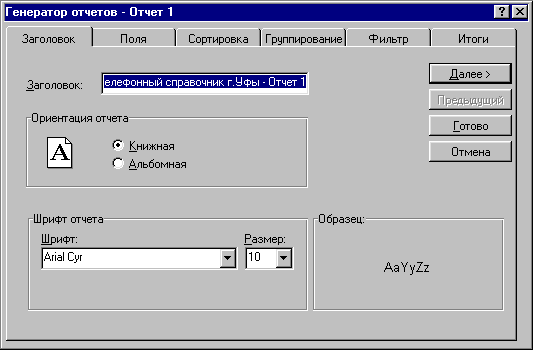 В закладке Заголовок записывается заголовок отчета.
