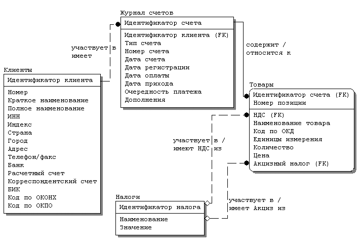 Основной таблицей в базе данных является таблица Журнал счетов. В таблице хранится информация обо всех выданных/полученных счетах фактуры. В ней хранится только общая информация о счете. Поле Идентификатор счета является первичным колючем, а поле Идентификатор клиента является внешним колючем для этой таблицы. По внешнему ключу Идентификатор клиента можно однозначно определить поставщика/покупателя, и все его реквизиты, для данного счета. Дочерней таблицей для Журнала счетов является таблица Товары. В ней хранится информация о товарах для каждого счета. Идентификатор счета, являясь внешним ключом, является вместе с Номером позиции также первичным ключом, по которому можно однозначно определить параметры товара. Внешними ключами также являются НДС и Акцизный налог от таблицы Налоги.