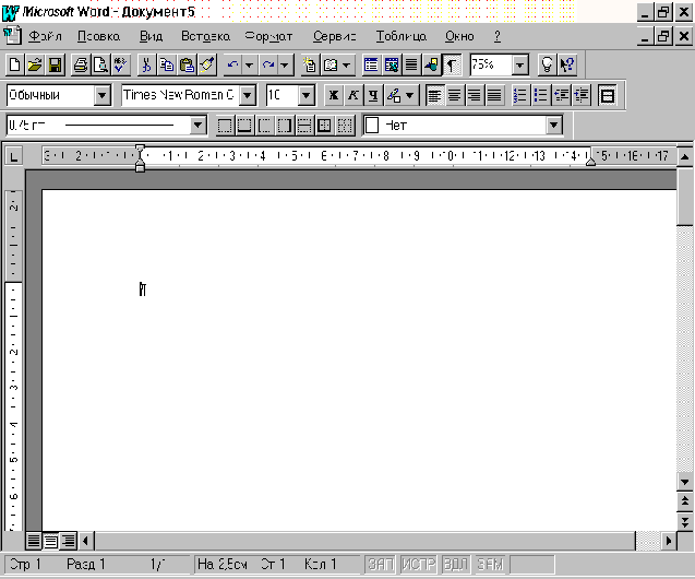 Строка состояния отображает информацию об активном документе (количество страниц, местонахождение курсора и т.д.), а при указании курсором на конкретную кнопку панели инструментов – кратко поясняет функции указанной кнопки.
