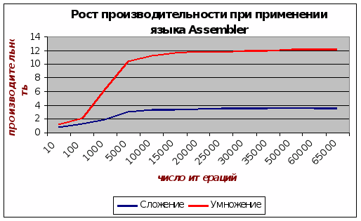 При применении языка Assembler рост производительности наблюдается от 10 итераций до 25000 и дальше стремиться к постоянному значению равному ~3,7. Даже такое увеличение производительности заметно скажется на работе некоторых приложений, использующих большие вычисления.