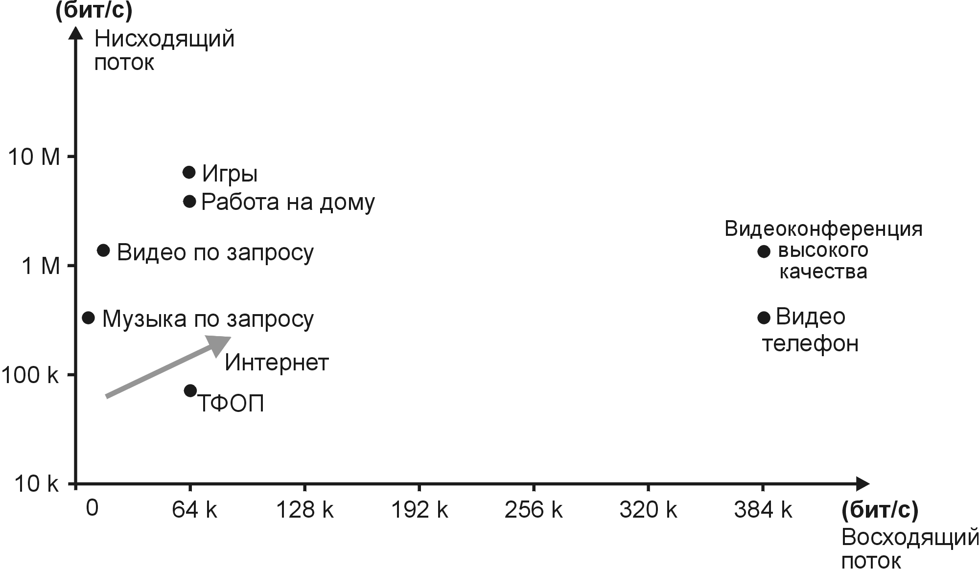 Высокая скорость нисходящего потока выбрана потому, что большинство домашних пользовательских приложений являются асимметричными. Бизнес пользователи, которым необходимы симметричные высокоскоростные приложения, используют оптический или коаксиальный кабель для обеспечения высокоскоростного двустороннего обмена данными. Поэтому технология ADSL была разработана в первую очередь для рынка домашних пользователей.