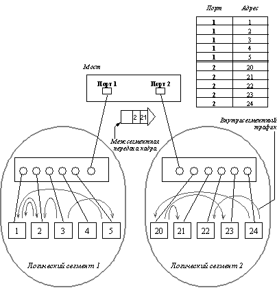 Мост (bridge), а также его быстродействующий функциональный аналог - коммутатор (switching hub), делит общую среду передачи данных на логические сегменты. Логический сегмент образуется путем объединения нескольких физических сегментов (отрезков кабеля) с помощью одного или нескольких концентраторов. Каждый логический сегмент подключается к отдельному порту моста/коммутатора (рис. 1.10). При поступлении кадра на какой-либо из портов мост/коммутатор повторяет этот кадр, но не на всех портах, как это делает концентратор, а только на том порту, к которому подключен сегмент, содержащий компьютер-адресат.