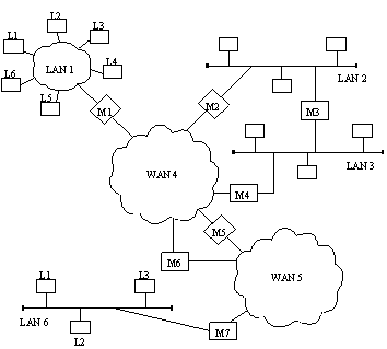 Маршрутизатор (router) позволяет организовывать в сети избыточные связи, образующие петли. Он справляется с этой задачей за счет того, что принимает решение о передаче пакетов на основании более полной информации о графе связей в сети, чем мост или коммутатор. Маршрутизатор имеет в своем распоряжении базу топологической информации, которая говорит ему, например, о том, между какими подсетями общей сети имеются связи и в каком состоянии (работоспособном или нет) они находятся. Имея такую карту сети, маршрутизатор может выбрать один из нескольких возможных маршрутов доставки пакета адресату. В данном случае под маршрутом понимают последовательность прохождения пакетом маршрутизаторов. Например, на рисунке 1.11 для связи станций L2 сети LAN1 и L1 сети LAN6 имеется два маршрута: М1-М5-М7 и М1-М6-М7.