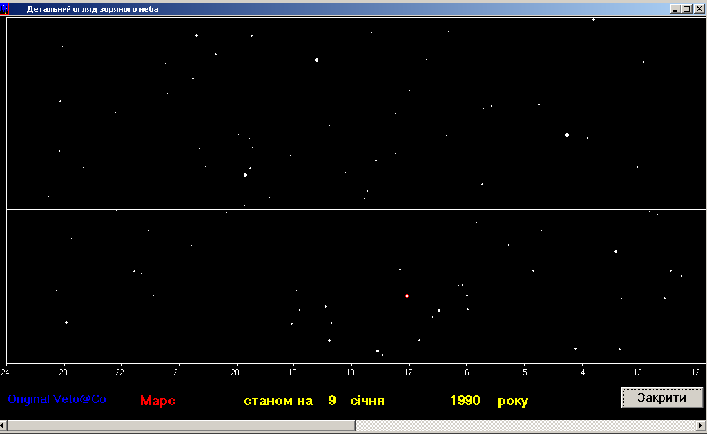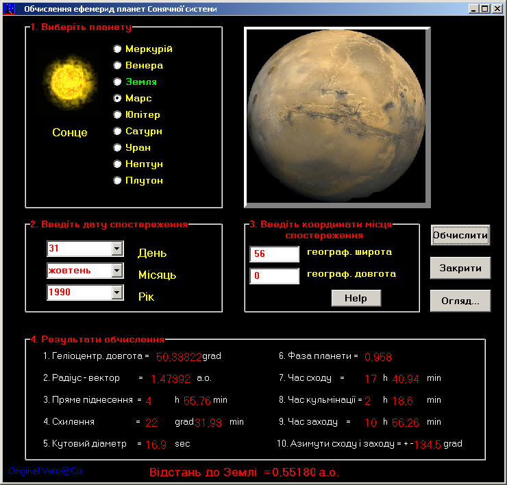 P.S. Не судіть надто мою необізненість в справах астрономії, тому що формули з цієї програми виводились мною будучи 15- літнім хлопцем, коли в школі розпочинають вчити тригонометрію. Хто зацікавився даною програмою може звернутися на vetoo@mail.ru , я з задоволенням вишлю її вам на шару.