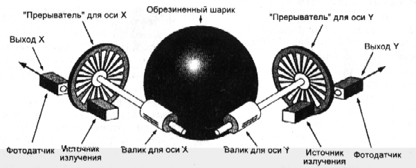 Устроена мышь довольно просто. Шарик касается двух валиков, один из которых вращается при движении вдоль оси X или вдоль оси Y. На одни оси с валиками обычно насажаны диски с прорезями («прерыватели»), через которые проходят (или не проходят) потоки инфракрасного излучения от соответствующих источников (инфракрасных излучающих диодов). При вращении дисков потоки излучения периодически прерываются, что регистрируется соответствующими фотодатчиками (обычно это фототранзисторы). Каждый импульс прошедшего излучения расценивается как перемещение на один шаг по одной из координат.