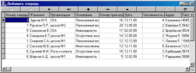 Фамилия, номер очереди, номер приказа, код организации, код основания, дата , номер паспорта, численность семьи, адрес.