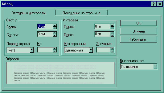 С помощью диалога Абзац можно установить любой из перечисленных в таблице 1 атрибутов. Оно открывается командой Абзац в меню Формат или же щелчком правой кнопки мыши в тексте и выполнением команды Абзац из контекстного меню. На рис.1 изображена вкладка Отступы и интервалы окна диалога Абзац, а на рис.2 - вкладка Положение на странице. Как и при работе с окном Шрифт, выбор атрибутов формата в окне диалога Абзац облегчается тем, что Word показывает образец текста, отформатированного с применением выбранных атрибутов.