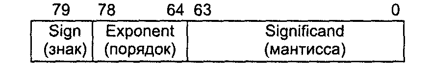 Сопроцессор оперирует данными в формате с плавающей точкой, который позволяет представлять существенно больше действительных чисел, чем целочисленное АЛУ центрального процессора. Арифметические операции (здесь под арифметическими понимаются операции, изменяющие значения операндов, а также операции сравнения) в FPU выполняются над 80-битными числами, преде га пленными во внутреннем формате расширенной точности (рис. 3). Формат позволяет представлять следующие категории чисел: