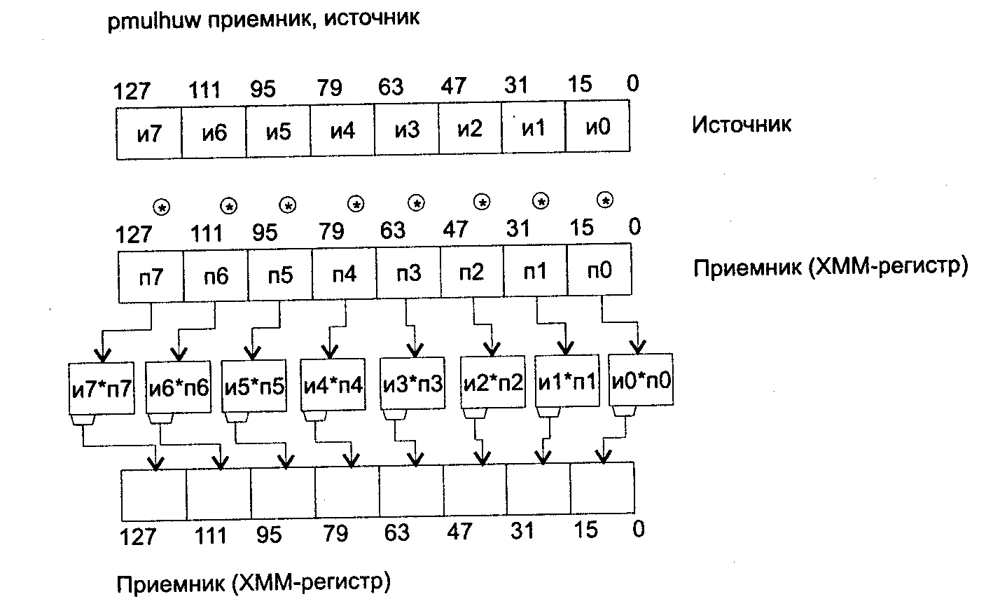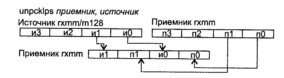 Действие: команды PUNPCKLBW, PUNPCKLWD, PUNPCKLDQ и PUNPCKLQDQ производят размещение с чередованием элементов из операндов источник и приемник согласно следующей схеме: