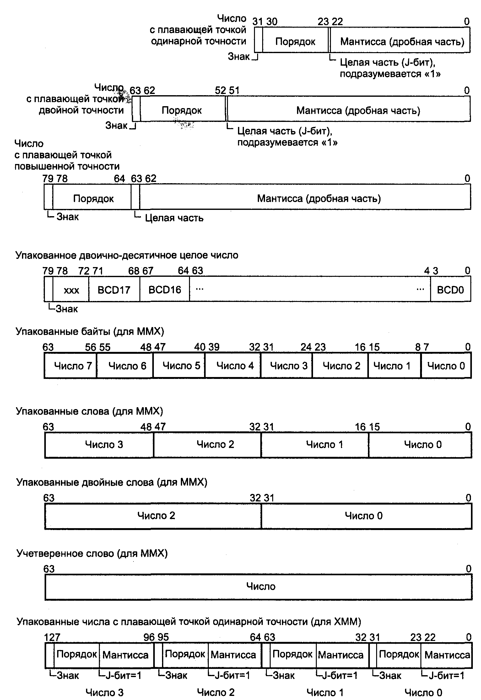 Числа в формате с плавающей точкой и упакованные 80-битные BCD-числа обрабатываются блоками FPU процессоров класса 486 и выше, а также сопроцессорами 8087/287/387. Упакованные 64-битные и 128-битные данные обрабатываются процессорами с ММХ и SSE. Форматы данных, обрабатываемых блоками FPU/MMX и ХММ, представлены на рис. 2.