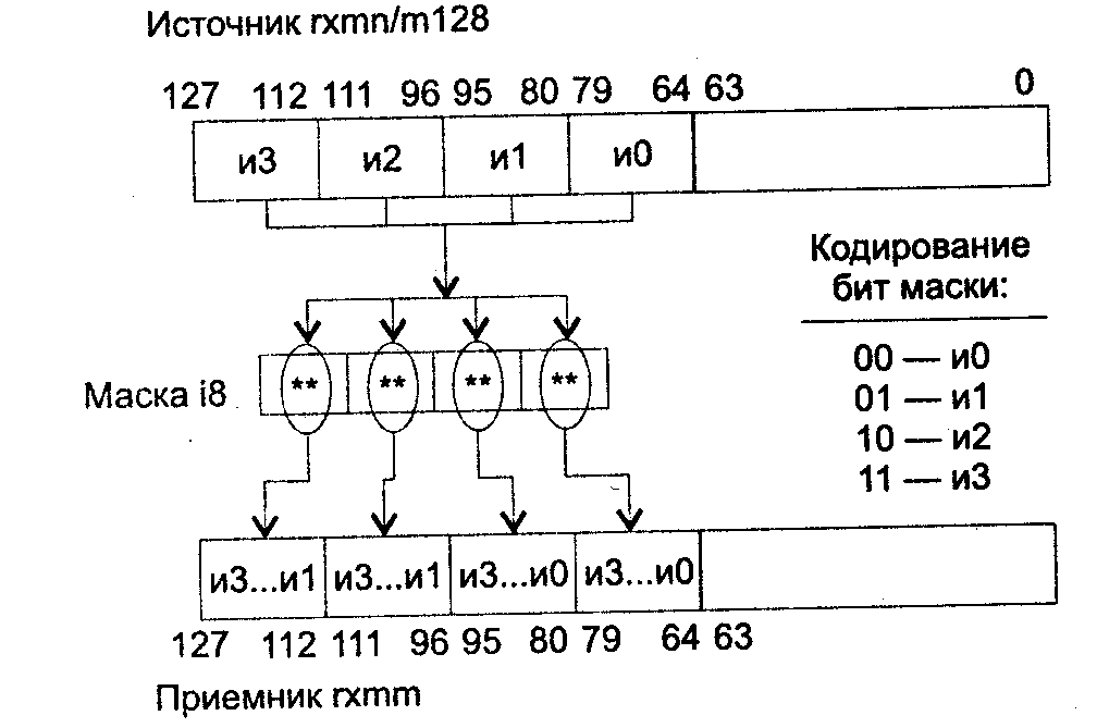 Действие: переместить упакованные значения с плавающей точкой двойной точности из приемника и источника в приемник в соответствии со значением непосредственного операнда маска. Биты маски определяют номера упакованных значений с плавающей точкой двойной точности в источнике или приемнике, которые будут перемещены в приемник следующим образом: