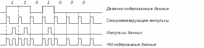 анной частотной модуляцией МЧМ (MFM). В УУ данные обрабатываются в двоичном виде и передаются в НГМД последовательным кодом (как последовательность нулей и единиц). Кодирование по методу ЧМ выполняется путем подачи дополнительного импульса для каждой единицы и отсутствие т