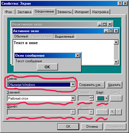 Вкладка «Оформление»: С помощью элементов данной вкладки можно полностью изменить на собственный вкус цветовую гамму, размеры и шрифт любого элемента стандартного интерфейса Windows.