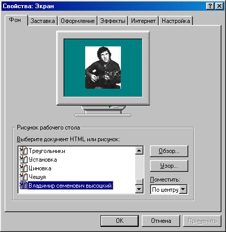 Вкладка «Фон»: можно выбрать рисунок, который будет на рабочем столе в качестве фона. Для этого или выбираем из появившегося списка рисунков (предустановленных в системе) понравившийся и нажимаем «ОК», или, используя кнопку «Обзор», переходим в нужную нам папку, содержащую нужный нам рисунок, выбираем его щелчком мыши (он появится в списке рисунков) и нажимаем «ОК».