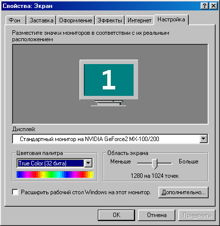 При щелчке на выпадающем списке пункта «Цветовая палитра» появится полный список поддерживаемых данной видеокартой количества цветов. Стандартные значения – 256 цветов, 16-битный цвет (65536 цветов), 32-битный цвет (4294967296 цветов). Единственного, пригодного на все случаи жизни совета по выбору режима палитры дать невозможно. Все зависит от типа задач, решаемых на данной машине. При профессиональной работе с цветными изображениями желателен максимальный режим (32 бита), при ориентации машины только на офисные приложения (Word, Excel и т.д.) возможна установка по минимуму вплоть до 256 цветов. В случае неверного отображения рисунков любой программой при минимальных установках рекомендуется выбор более высоких значений до получения удовлетворительного результата.